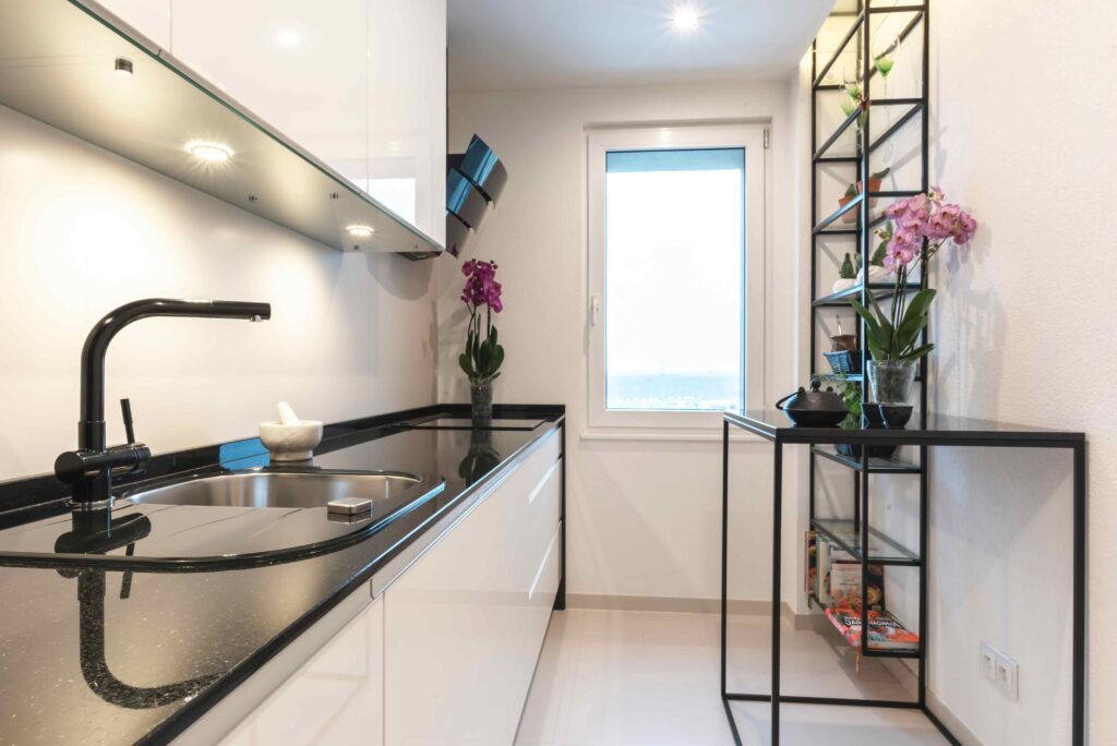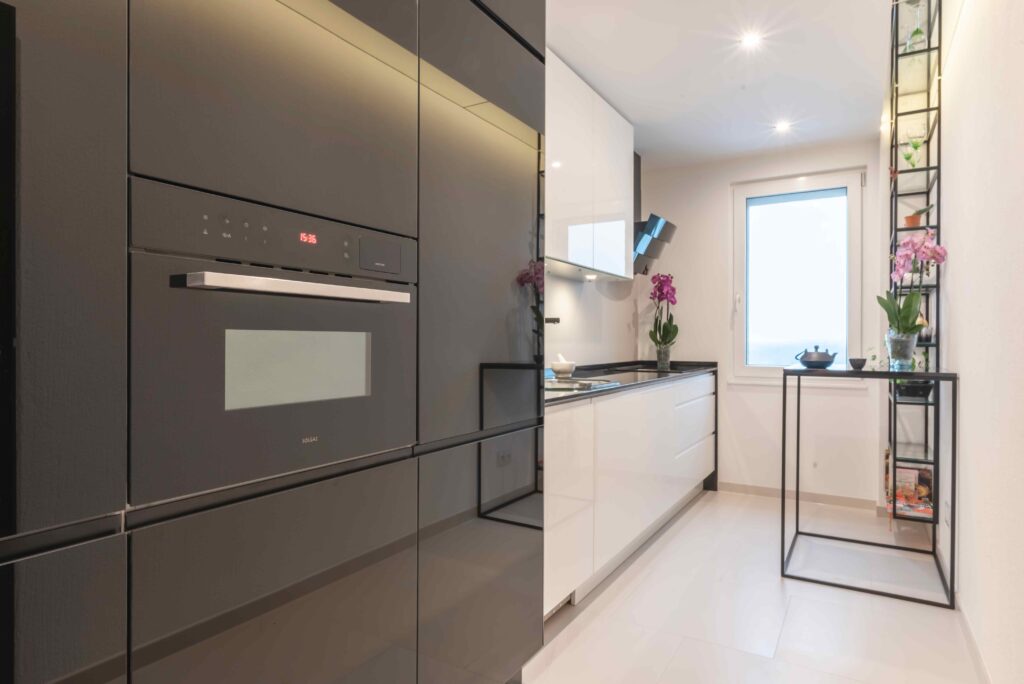 Wąska kuchnia nowoczesnaz białym lakierem_szafa z czarnego szkła_hesrbata w funkcjonalnej kuchni