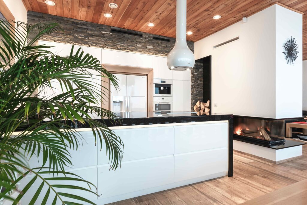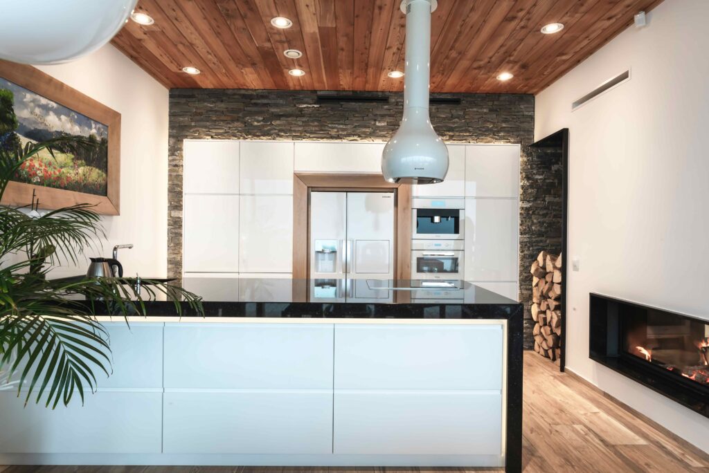 Kuchnia nowoczesna w góralskim domu_kominek przy kuchni