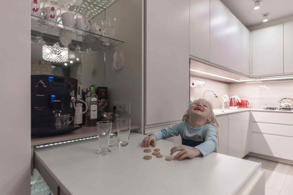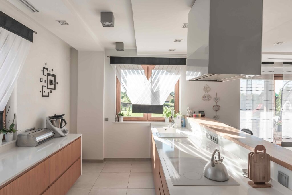 Minimalistyczna kuchnia z blatem we wnęce_wysunięty blat